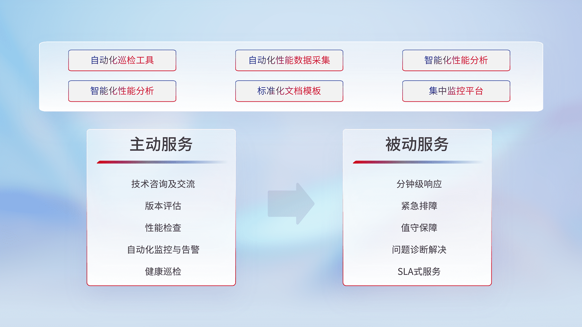 智能化工具和标准化文档,,,,保障服务质量,,提供主动服务(包含技术咨询、、、版本评估、、性能检查、、自动化监控与告警、、、、健康巡检)和被动服务包含(分钟级响应、、紧急排障、、值守保障、、问题诊断解决、、SLA服务)。。。。